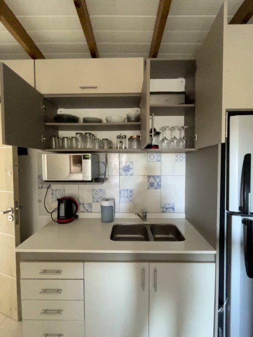 La unidad consta de COMEDOR con cama nido y colchones de alta densidad para dos pasajeros. Juego de mesa y sillas de madera, TV LED y equipo de Aire Acondicionado. Además de balcón con vistas a calle Garay. COCINA INTEGRADA equipada con horno y cocina eléctrica, heladera con freezer, tostadora, pava eléctrica, microondas y exprimidora; sartén, wok y cacerolas “Hudson”.