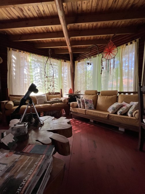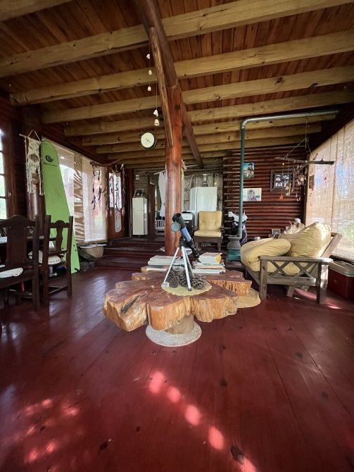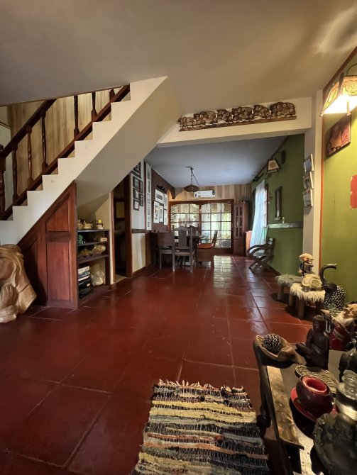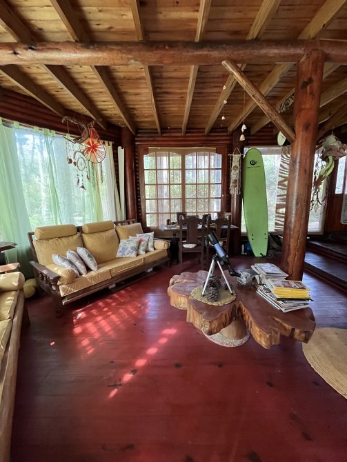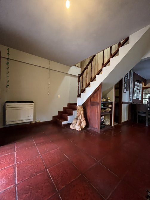 Al ingresar, en planta baja ofrece un recibidor con hogar a leña, amplio comedor y cocina independiente. Al fondo, con ventanales y vista de 360° al bosque y excelente disposición, amplio living amueblado en algarrobo.
